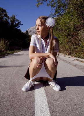 Молодая шлюшка дрочит бритую пизду на дороге