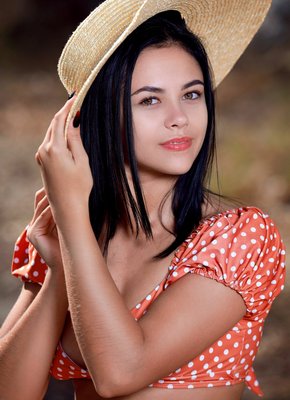 Описание: Кокетливо играясь перед камерой со своей большой шляпой, симпатичная молодая брюнетка в красивом купальнике бесстыже раздевается до гола и позирует на природе. Загорелая стройняшка с сочными упругими титьками ложится на большой горячий камень и развратно раздвигает длинные ноги, похотливо подставляя к камере свою бритую жадную пизду.