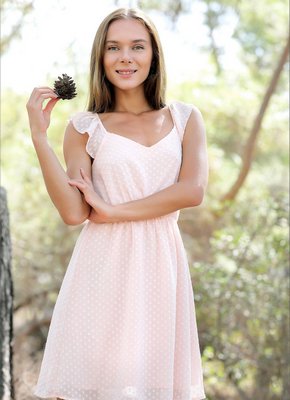 Описание: Молоденькая нежная нимфа с худенькой фигурой в коротком платье без нижнего белья прогуливается по лесу и мило улыбается. В будущем сексуальная девушка все же приподняла юбку и сделала акцент на аккуратной попочке и гладко выбритой письке, а оголившись полностью засветила маленькие сиськи.