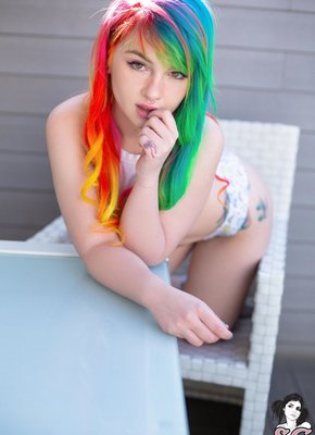 Описание: Меняя позиции на дачном кресле за столом, неформалка с яркими волосами в трусиках и носочках особенно часто прогибается раком и делает акцент на большой упругой жопе. В процессе молоденькая девушка умудрялась игриво строит глазки и возбуждающе приоткрывать ротик.